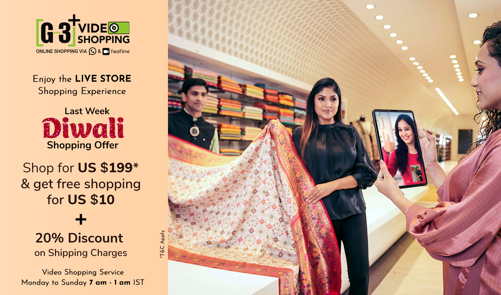 Choose festival party saree for Diwali, Pujas, Navratri while sitting in USA, UK, Canada, Australia, Singapore, South Africa, UAE, New Zealand, Mauritius and many more from G3+ Video Shopping for Sarees.